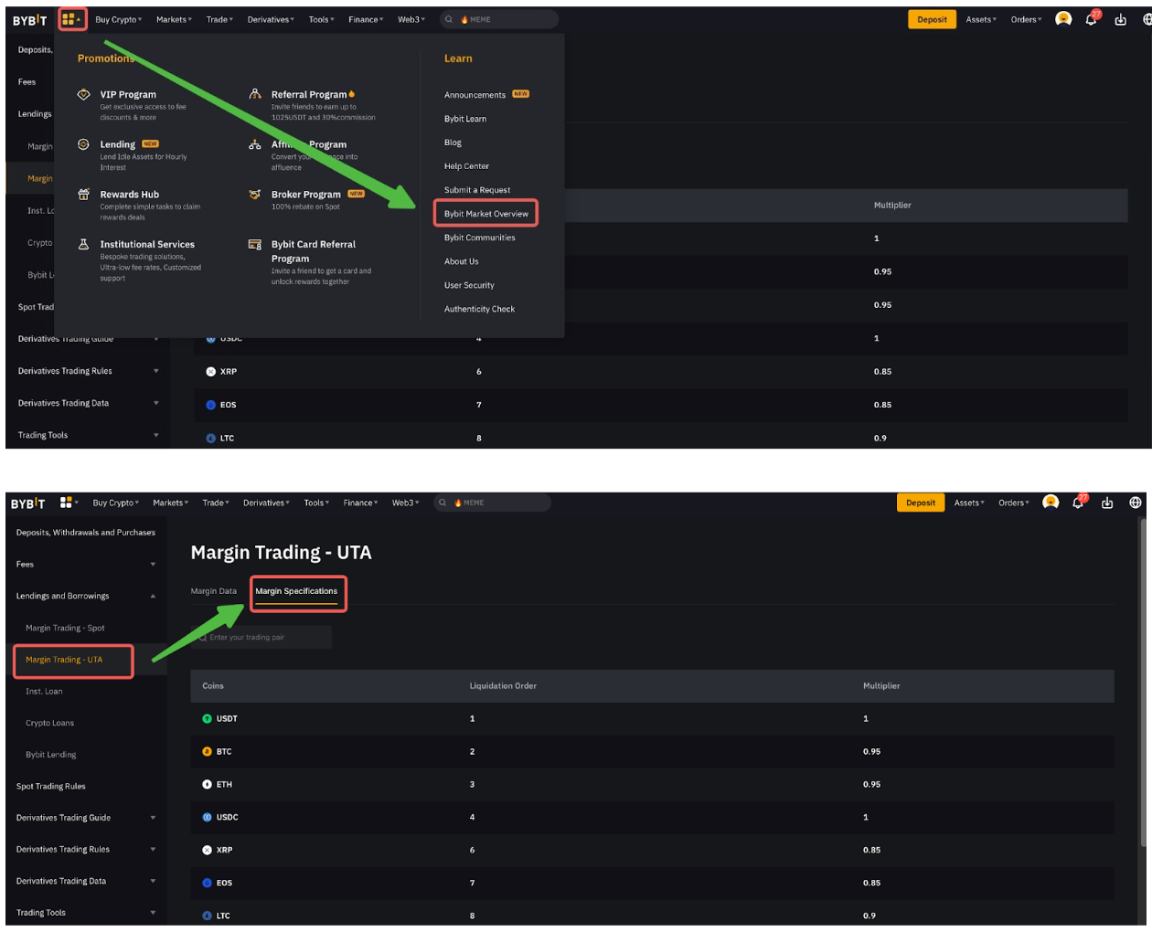 To view the collateral value ratio for each coin under Unified Trading Account, please go to the Application icon on the upper left corner and select Bybit Market Overview.