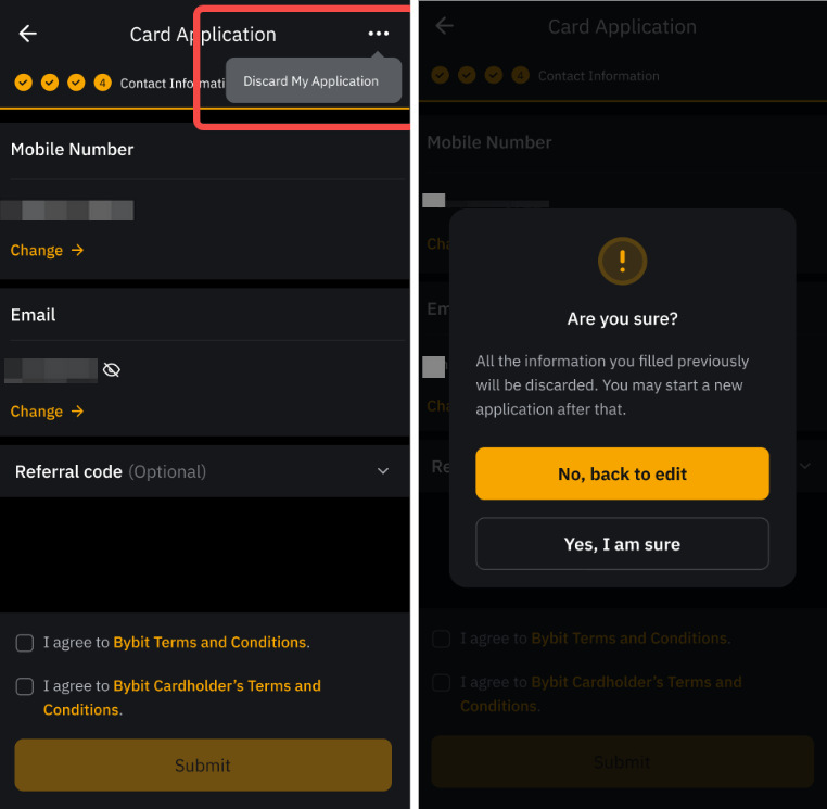You can cancel your Bybit Card application by submitting a request here to seek assistance from our Customer Support team.