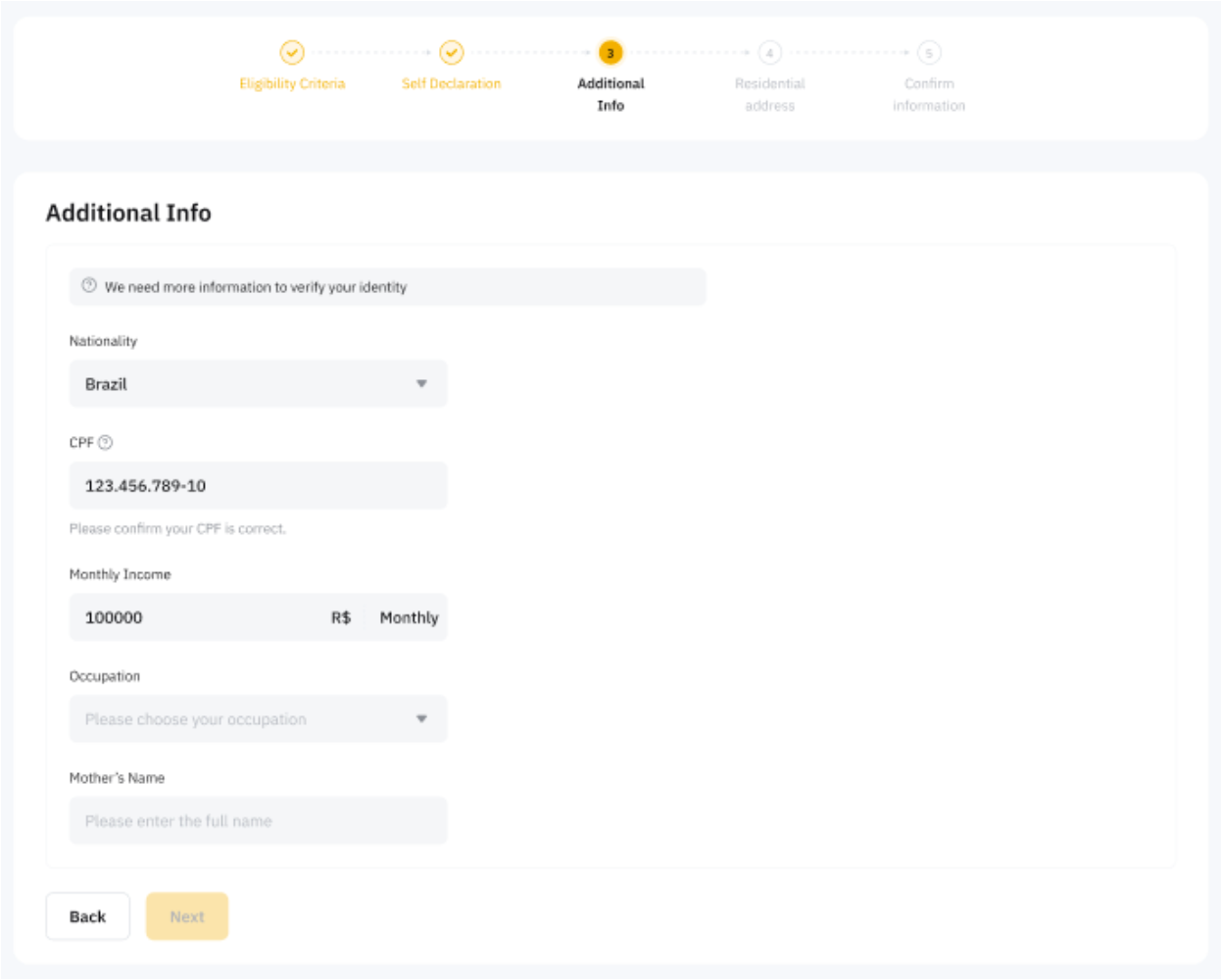 Step 5: Provide additional information about your nationality, CPF, monthly income, mother’s name and occupation.