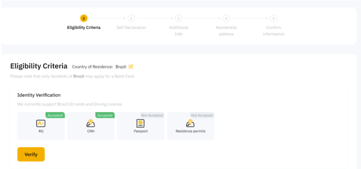 Note: Bybit Card has more stringent requirements for Identity Verification. Hence, you may be required to update your Identity Verification even though you have already completed it on your Bybit account previously.