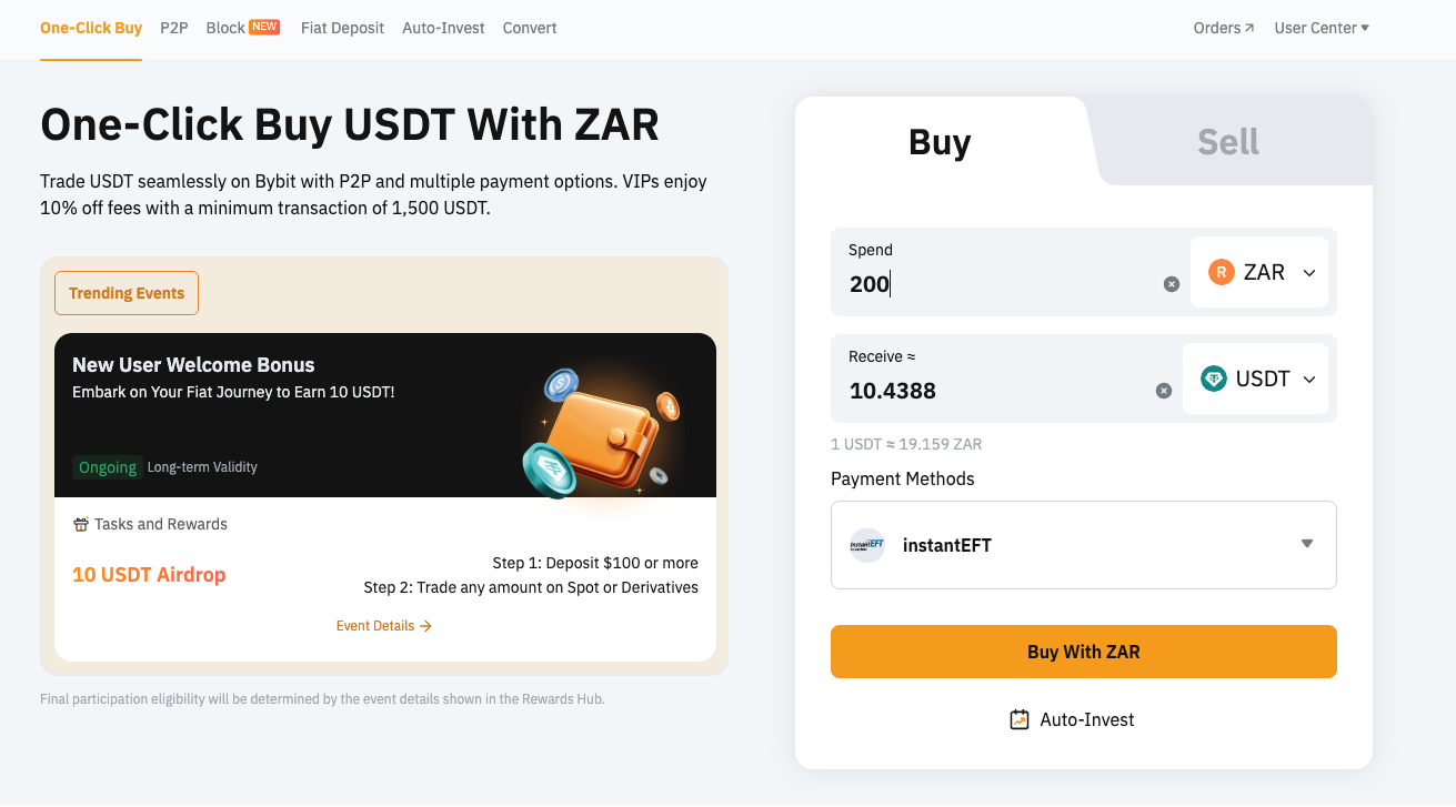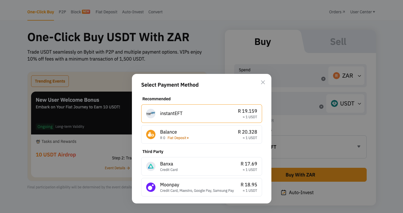 Bybit's Instant EFT service for South African Rand (ZAR) deposits makes investing in cryptocurrency simple, fast, and secure with funds typically arriving within minutes.