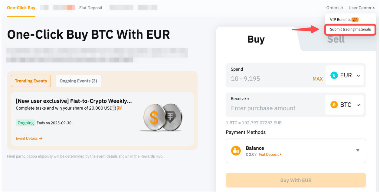 Step 2: Click on Submit Trading Materials under the User Center in the upper right corner of the One-Click Buy page.