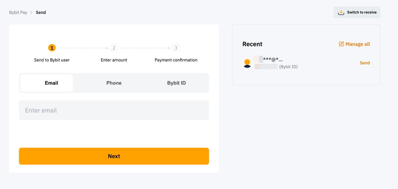 Step 2: Select the type of method for the internal transfer payment. You can send the payment to other Bybit Pay users by entering their: