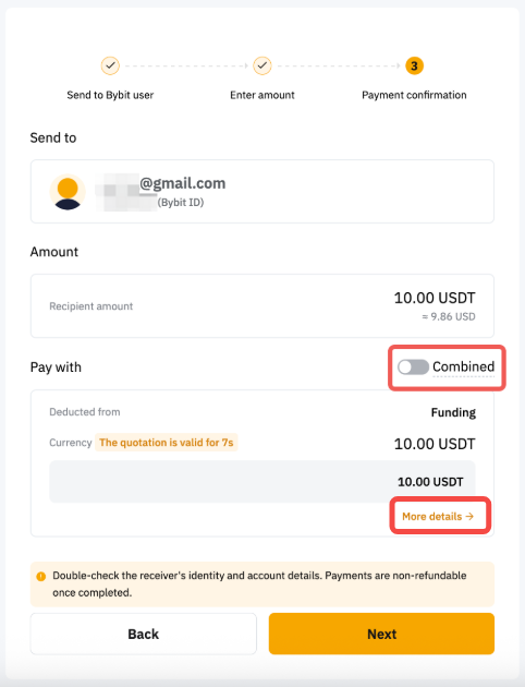 Note: The Combined button allows you to send combination payments using the funds available in your Funding account first, followed by the funds available in your Earn account.