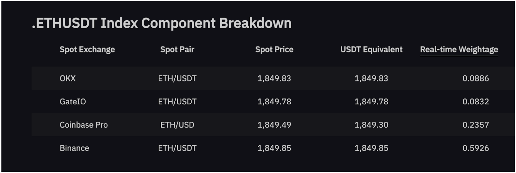 The index price depends on three (3) variables: Spot Price, USDT-Paired Equivalent and Real-time Weight.