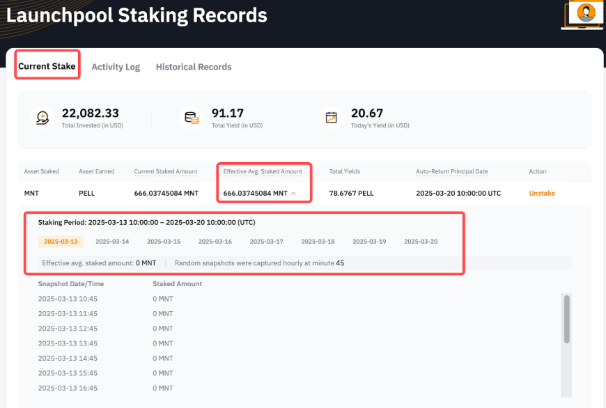 The Launchpool snapshot results and daily random snapshot times will be displayed under the Effective Avg Staked Amount section in the Launchpool Staking Record on the next day after the daily snapshot ends. You can select a specific date to view the snapshot time and results.