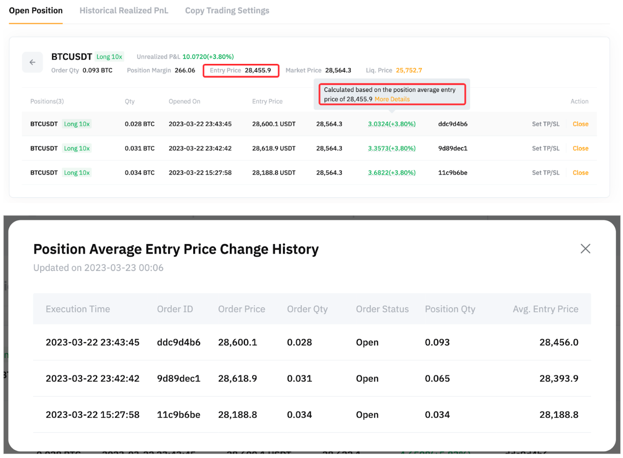 此时,跟单用户 A 可以在开仓选项卡中看到,其仓位的开仓均价实际上是 28,455.90 USDT,该数字将作为计算未结盈亏或平仓盈亏的基准价。如需查看仓位开仓均价变更历史,跟单用户 A 可以将光标悬停在带下划线的未结盈亏上,并点击更多详情