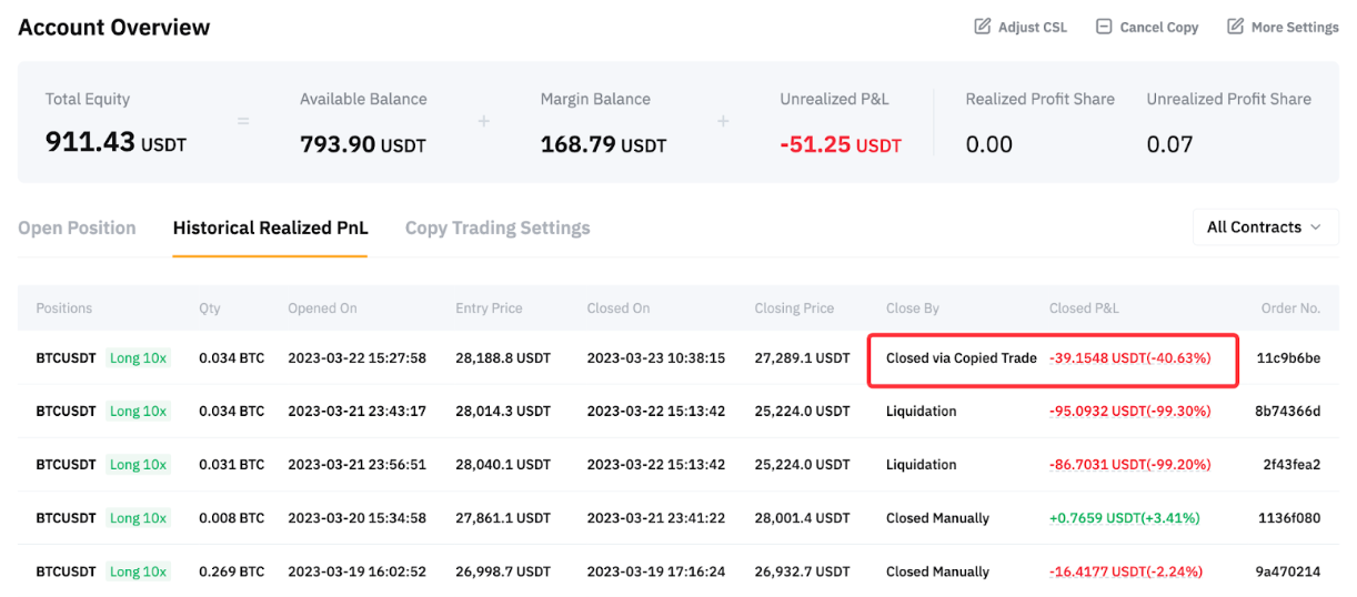 在已结盈亏历史页面,我们可以看到该笔订单通过跟单交易平仓,平仓盈亏为 -39.1548 USDT。