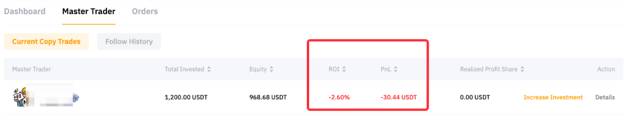 该仓位的已结平仓总盈亏为 -30.4471 USDT,收益率 (ROI) 为 -2.61%。 ROI 的计算方式如下:ROI = [总净值 -(总投资额 - 跟单期间减少的投资额)]/(总投资额)ROI = [968.68 - (1200 - 200)]/1200 = -2.61%