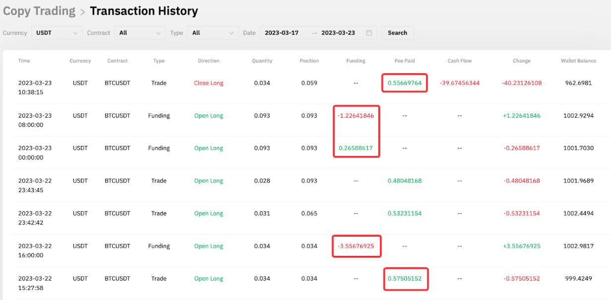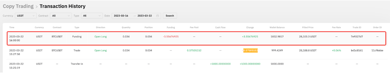 当日 16:00 (UTC),该仓位未平仓,因此将产生资金费用。以下截图显示,资金利率为负,因此持有多仓的跟单用户 A 获得了相应的资金费用。该笔 3.55676925 USDT 的资金费用已添加至该跟单用户的可用余额中。