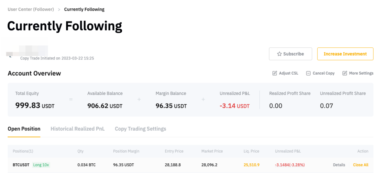 此时,跟单用户 A 的唯一已结盈亏即为该仓位的建仓费。跟单用户 A 可参考仓位详情中的的开仓费用或前往跟单交易交易历史记录查看当前已结盈亏详情。