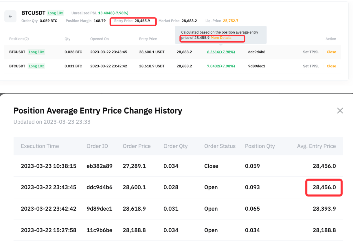 由于开仓均价不会受到减仓的影响,可以看到,此时的开仓均价仍为 28,455.90 USDT。