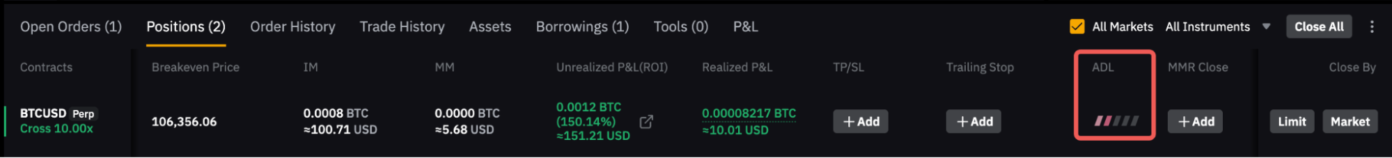 交易者可在持仓区中查看每个仓位的 ADL 排名。