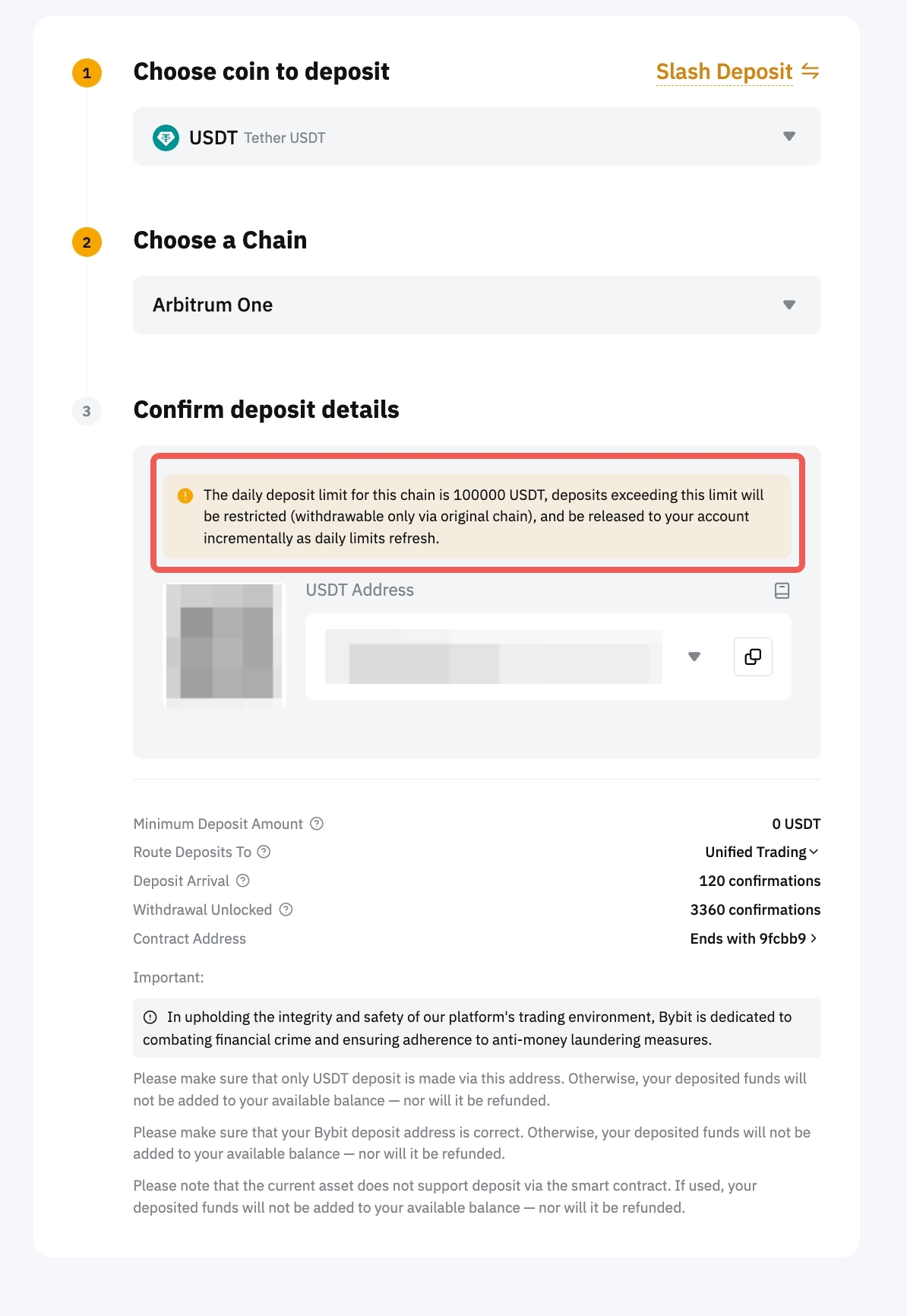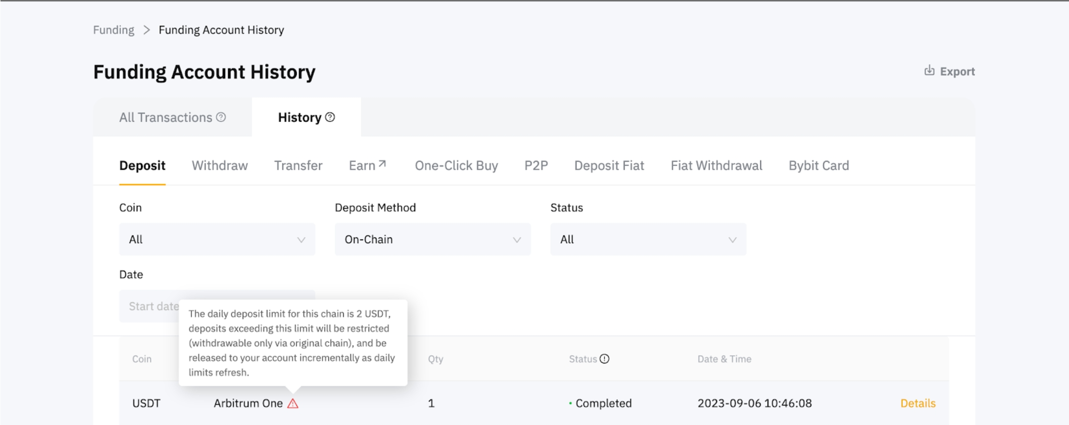 Bybit 为每个特定的区块链设立了每日充值限额。超过此限额的充值资产将暂时成为不可交易资产,可在资金账户页面的待处理资产部分查看。