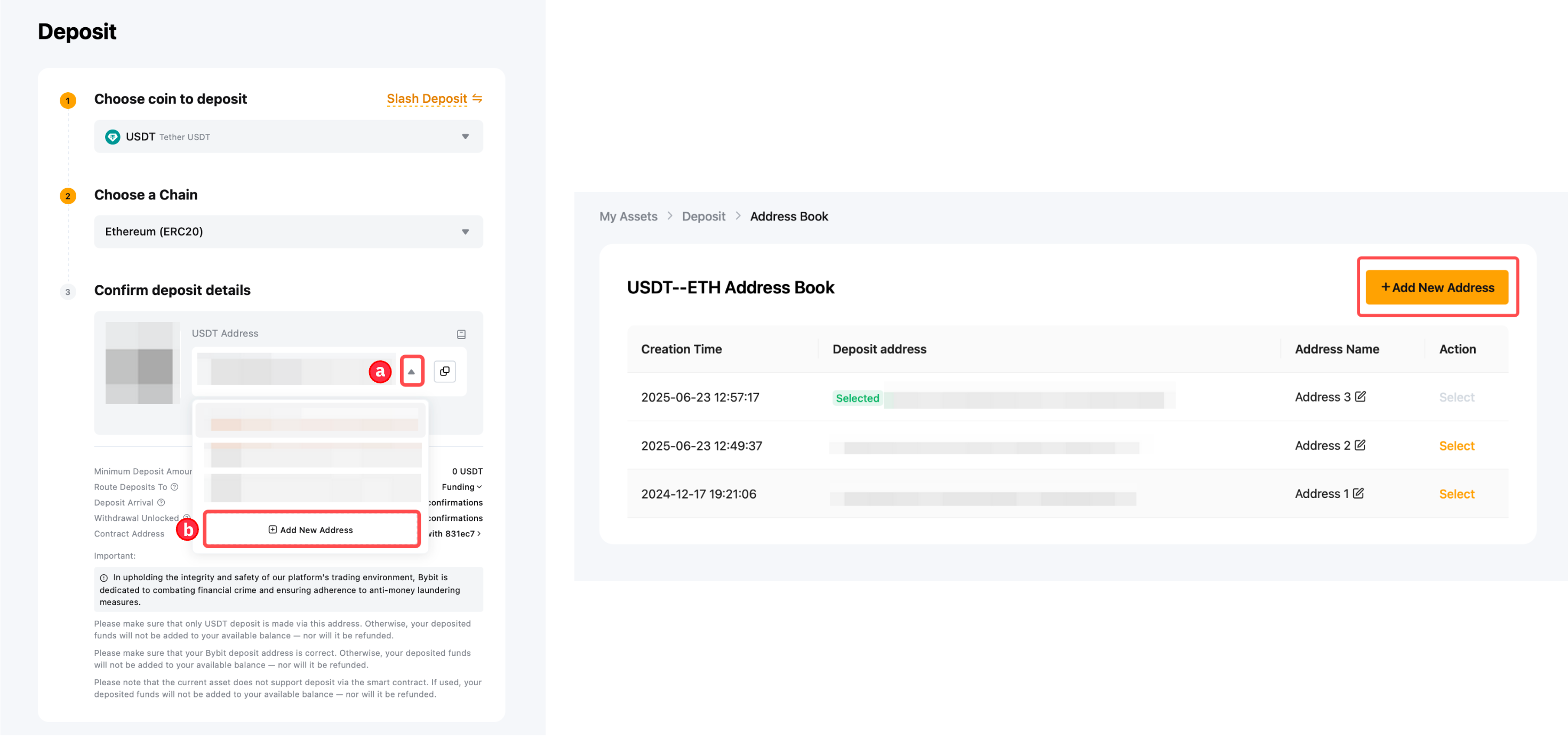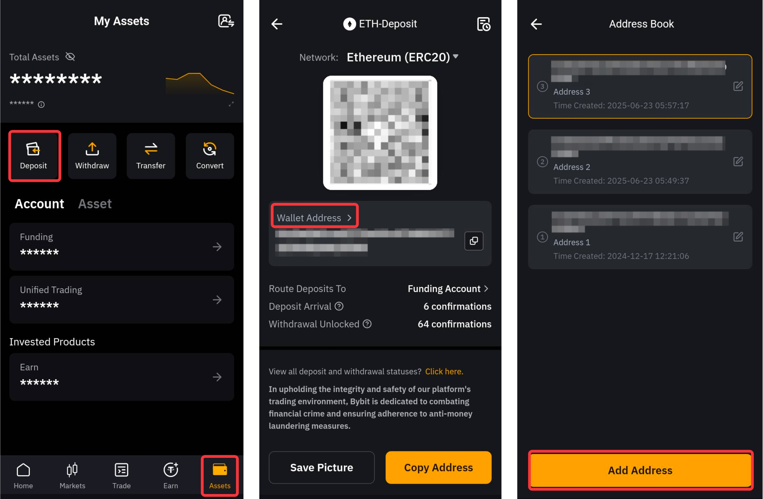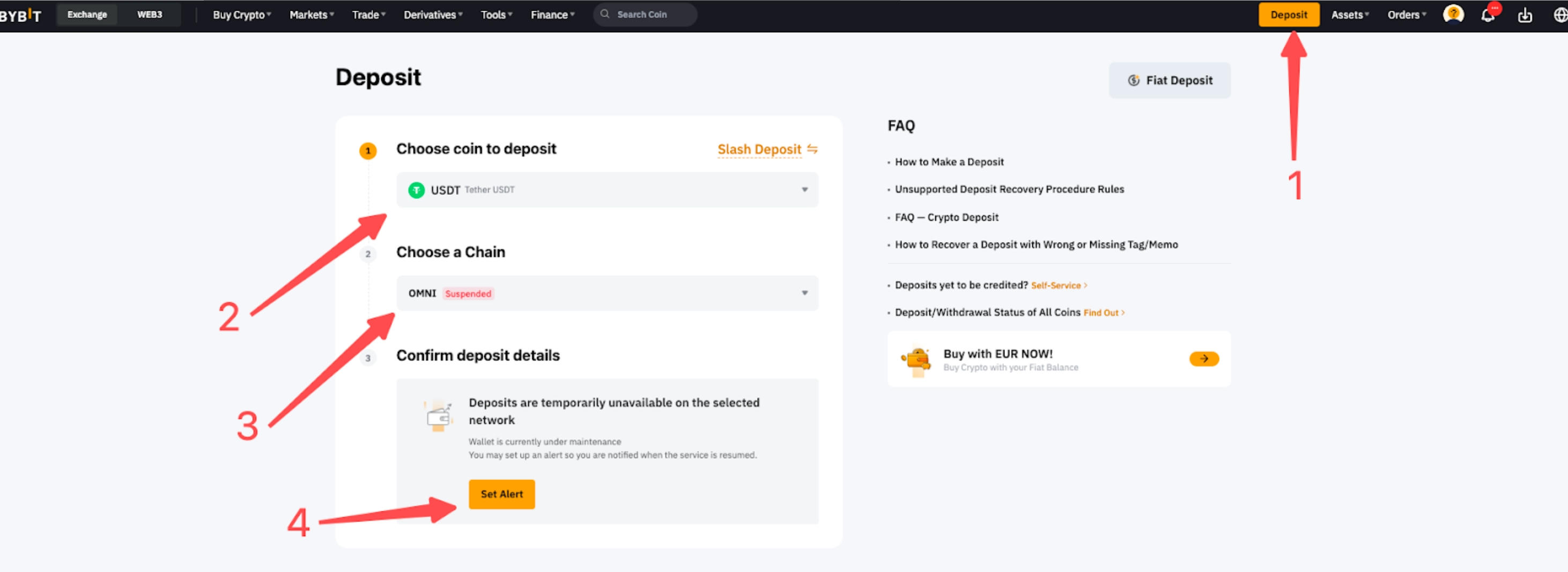 Bybit 仅支持通过相关的标准区块链充入交易者的“资产”页面上列出的代币。