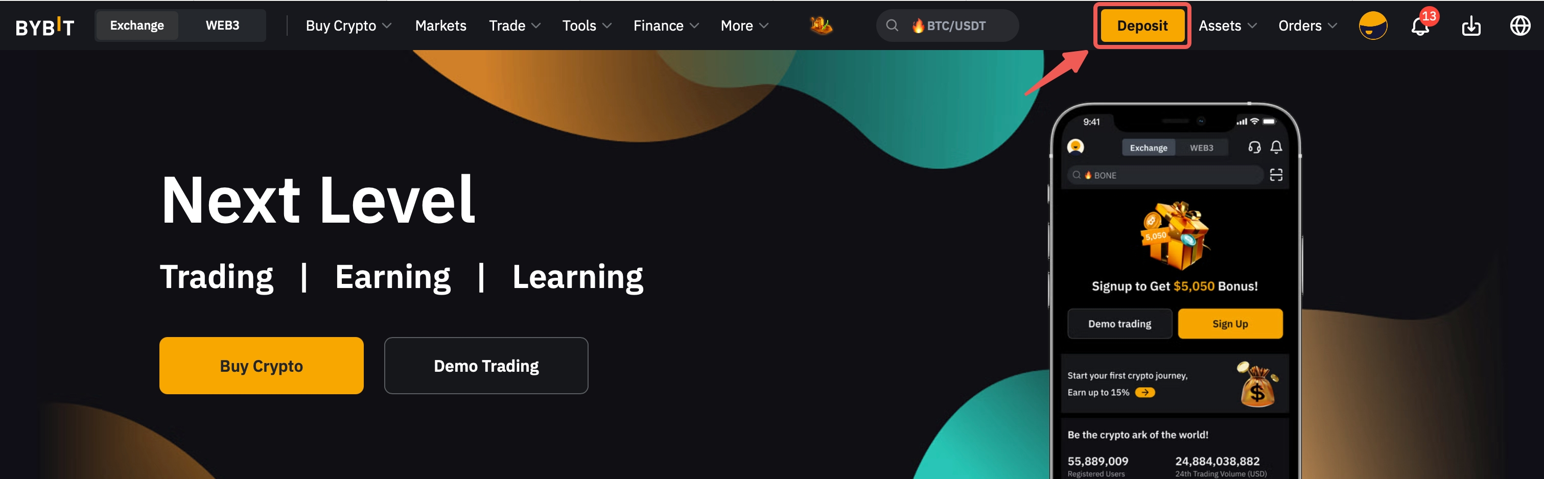 或者,您也可以在 Bybit 页面右上角找到充值入口。