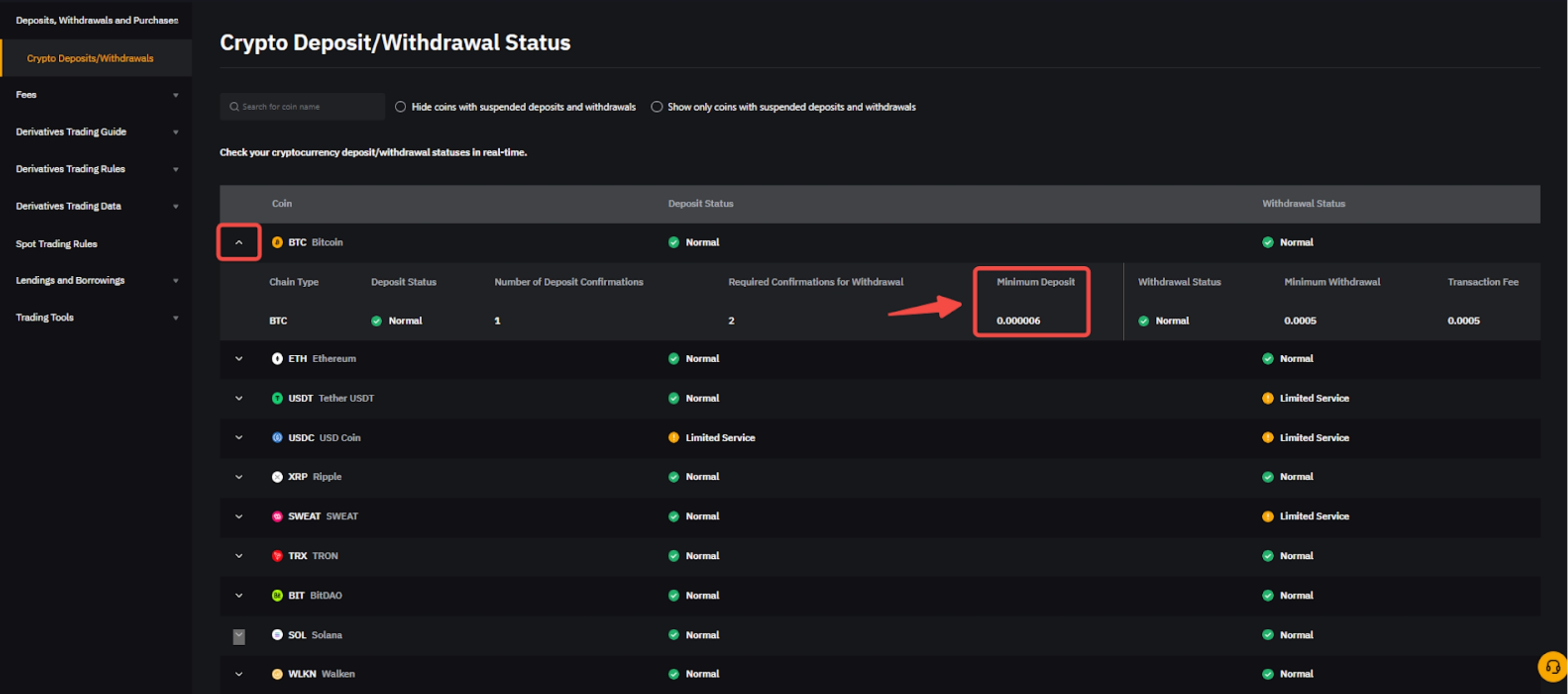 您可以在加密货币充提状态页面上找到每个币种的最低充值限额。点击要充值或提取的代币的下拉按钮,即可查看每个受支持的链的充值状态,以及成功完成充值所需的操作信息。
