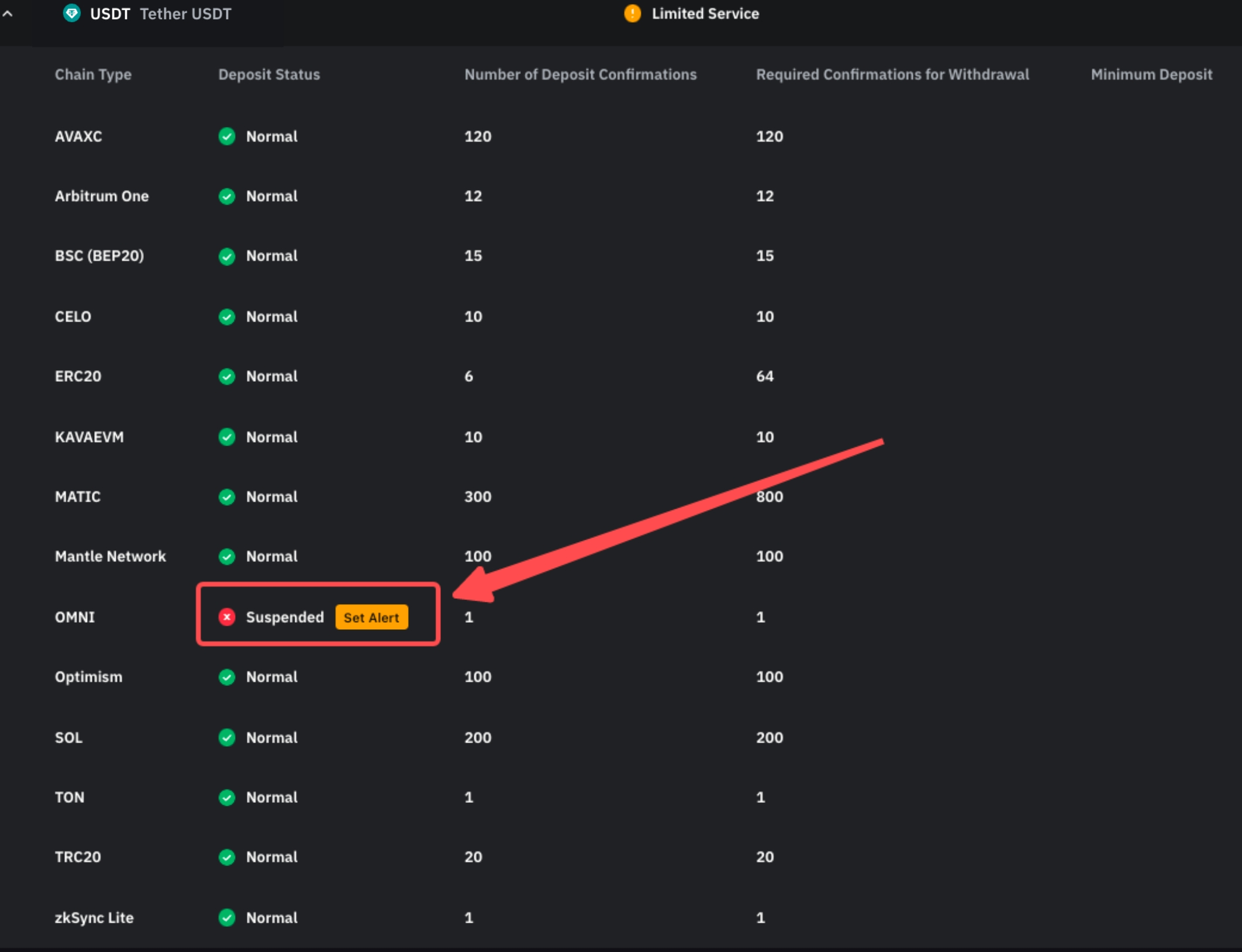 或者,您也可以前往充值/提币状态页面,搜索代币和链。 “暂停”充值状态旁边将显示设置提醒按钮。