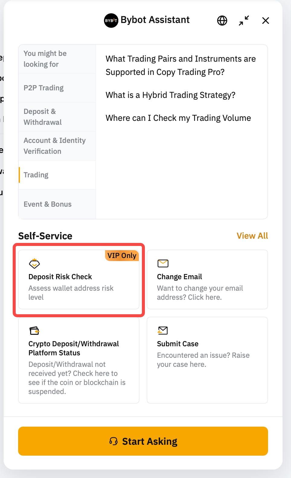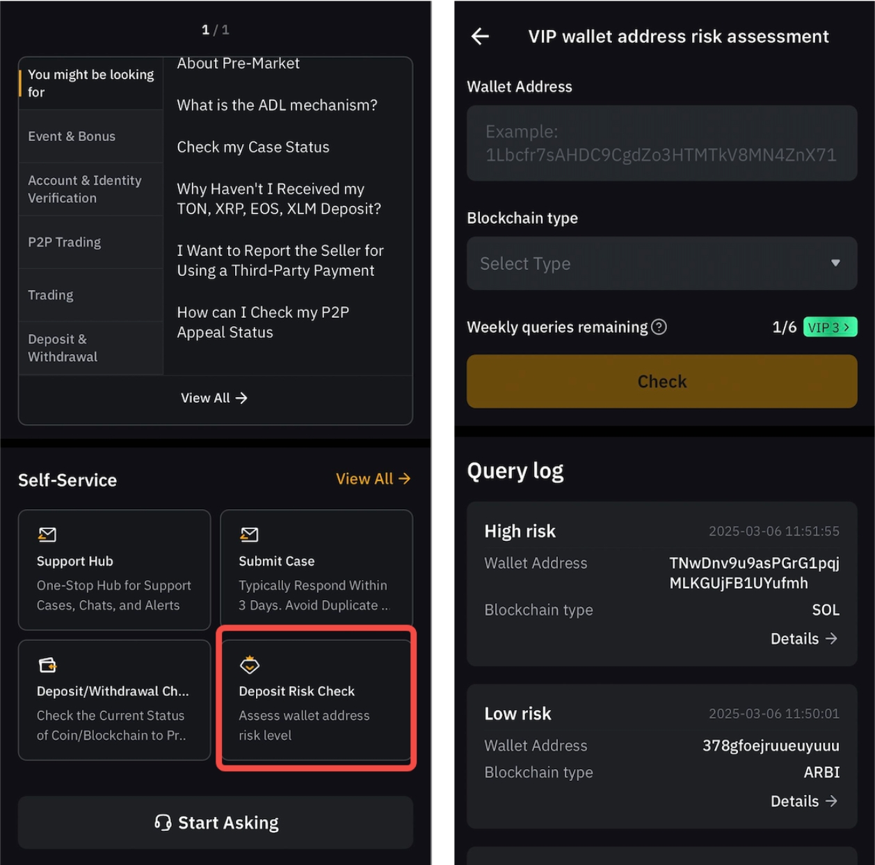 是的,目前只有 VIP 用户可通过自助服务机器人和充值页面访问地址风险功能。用户可点击验证充值来源地址风险访问页面。
