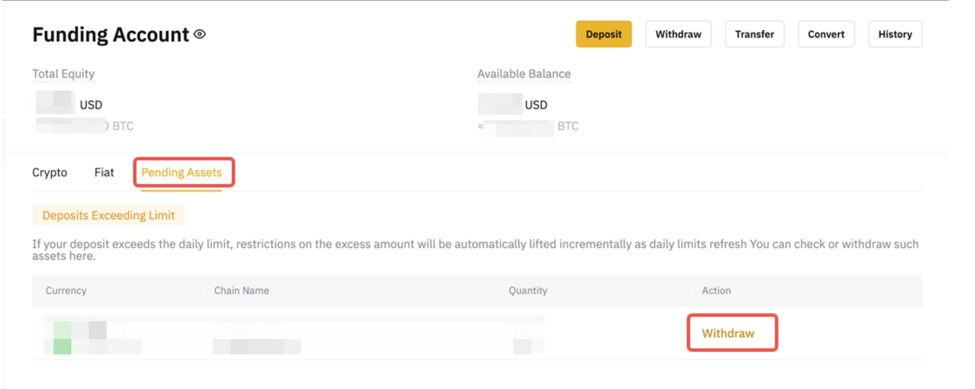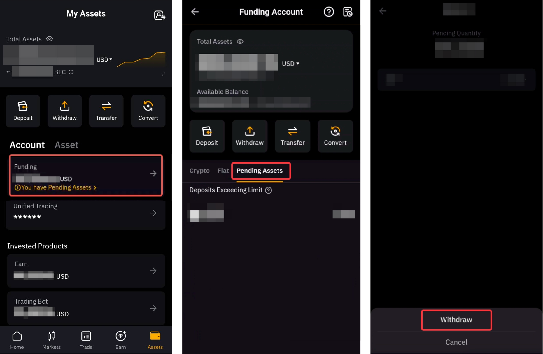待处理资产是指等待特定区块链进行入账确认的充值资产。这些充值资产需要一定的时间才能进行交易或提币,且受充值限额限制。