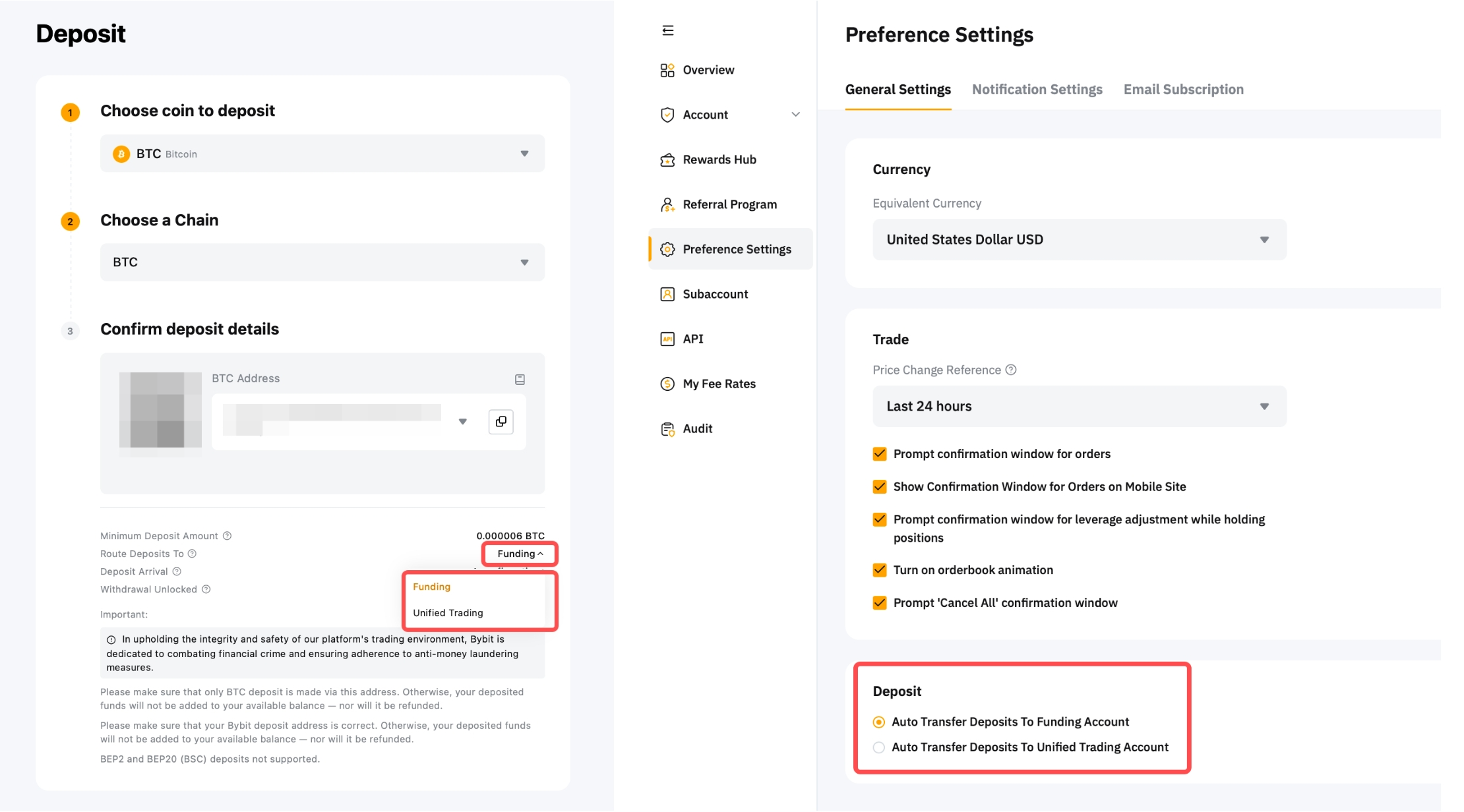 默认设置为资金账户。但是,您可以在“存款”页面或“设置”页面上将存款目的地更改为您的统一交易账户。