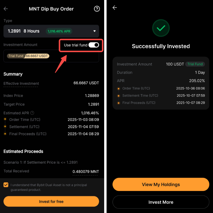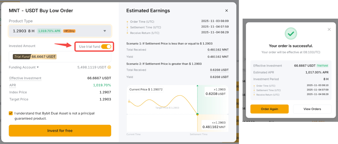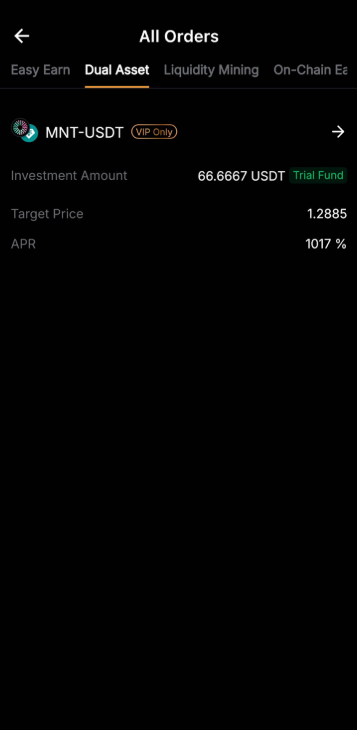 双币投资试用基金允许您体验实际的双币投资回报,而不会应用任何成本。您的收益由产品的结算价格和年利率决定。虽然收益将添加到您的账户中,但试用基金本金将不会计入您的总资产。