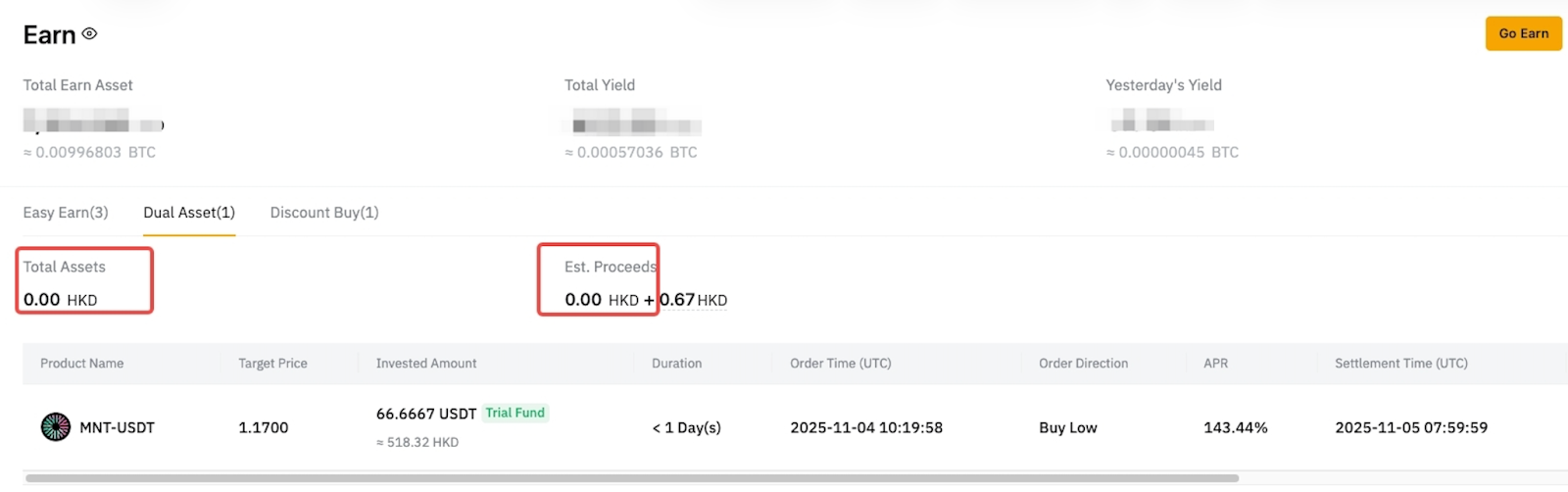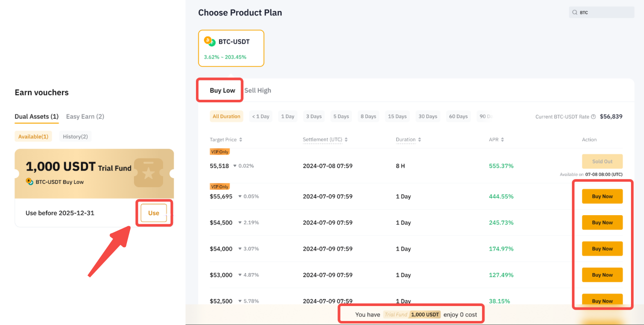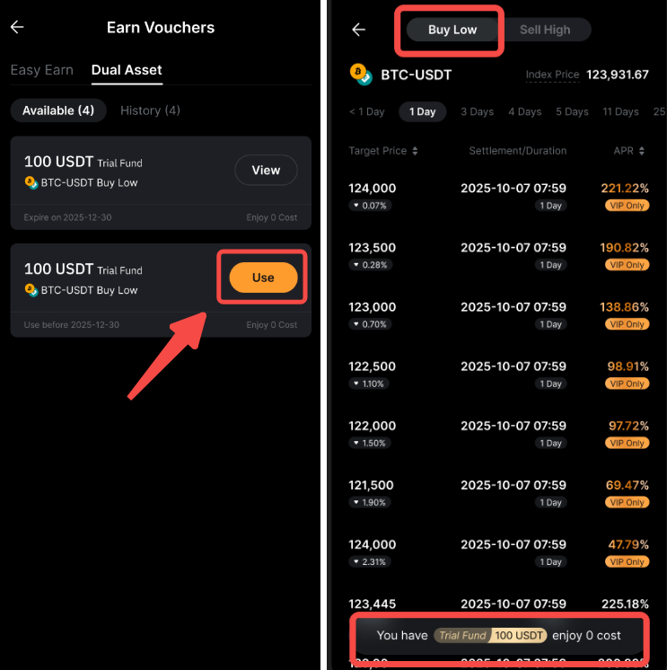 注意:此试用基金奖励仅适用于双币投资 - 低买产品。