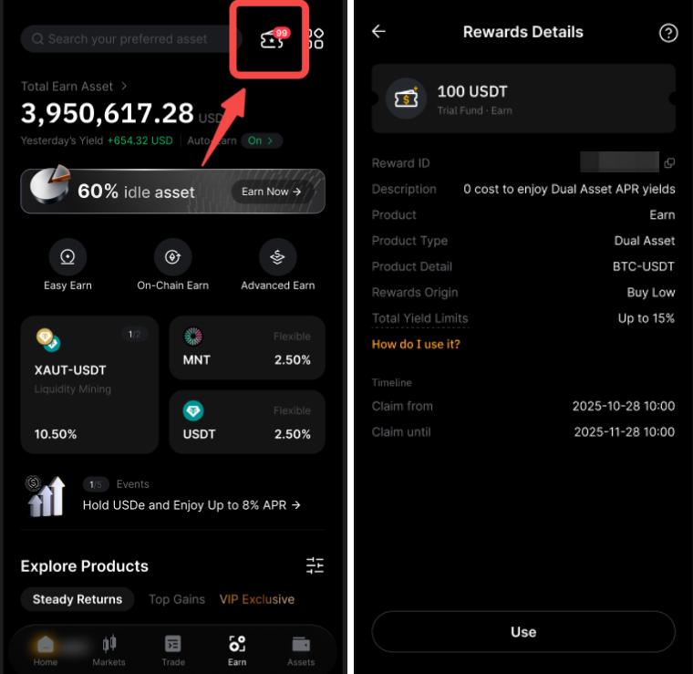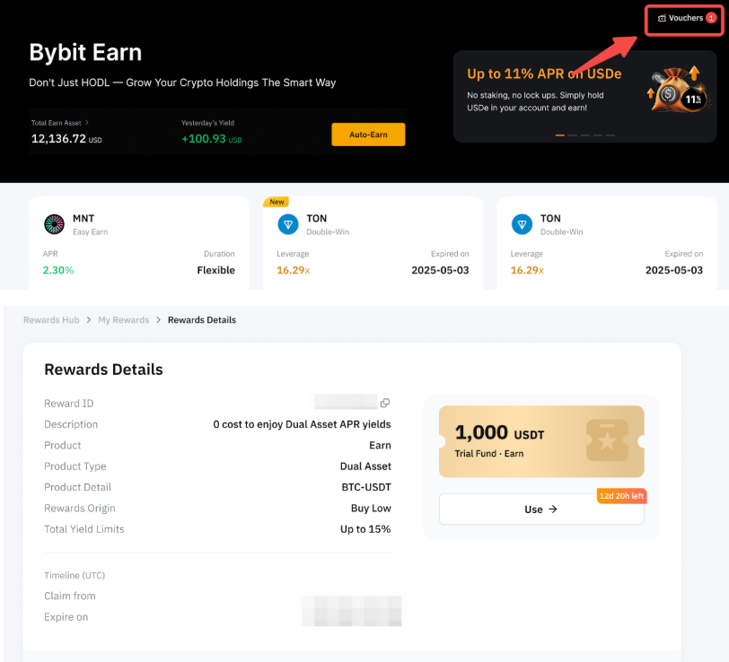 如果您有资格获得双币投资产品的试用基金,您可以在理财商城页面右上角的 Voucher 找到奖励。或者,您也可以在我的奖励页面上找到这些试用基金奖励。