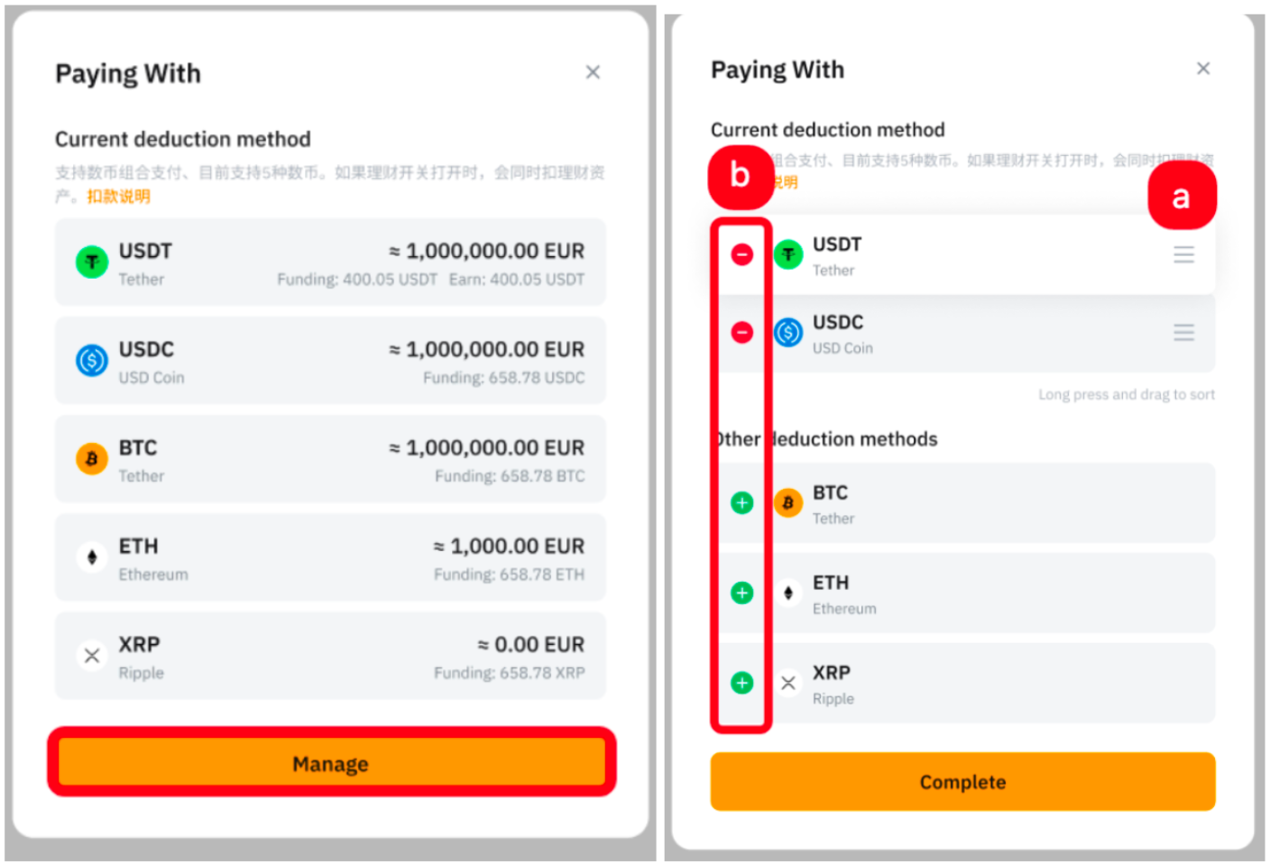 单击付款方式,系统将提示您进入管理窗口。然后,您可以 (a) 通过上下拖动来管理订单,或者 (b) 从列表中添加和删除硬币。完成后,您可以使用 Bybit 卡进行购买,系统将遵循您设置的支付优先级。