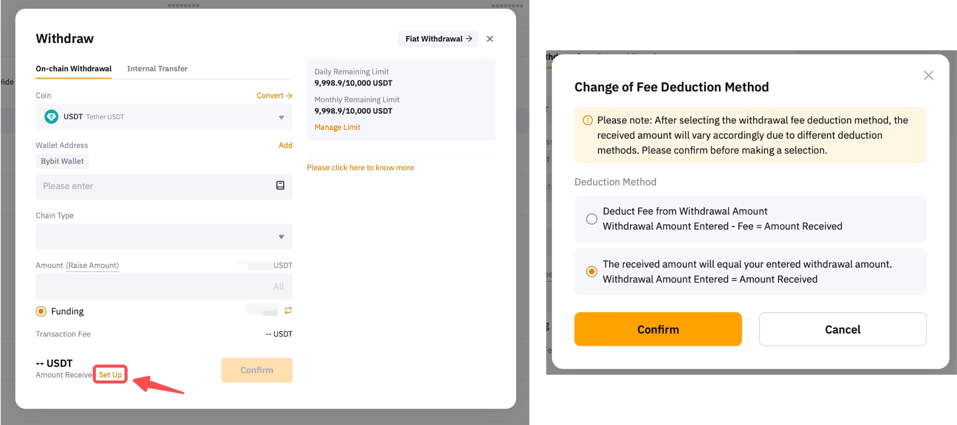 默认情况下,提币费用将从指定的提币金额中扣除。 但是,您可以通过点击设置并选择首选扣除方式来修改此设置。