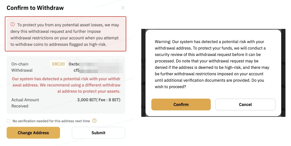 当系统检测到提现地址存在任何潜在安全风险时,我们强烈建议您考虑使用其他提现地址。