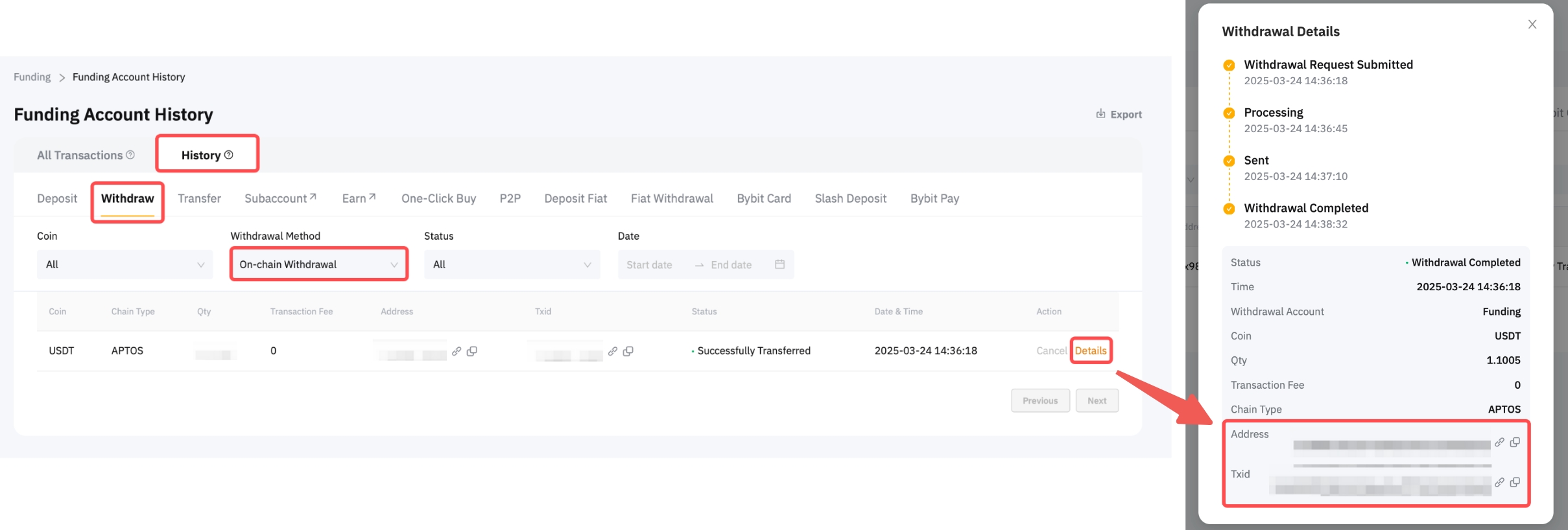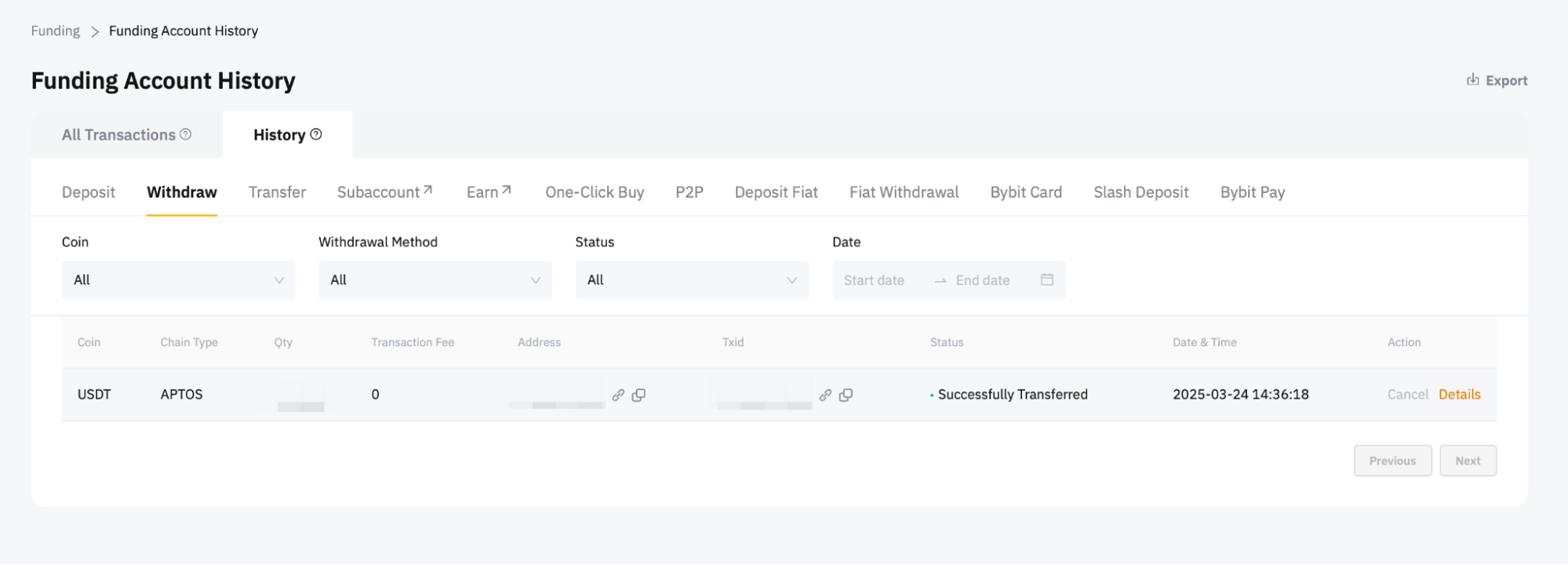 请注意,被视为提币的行为包括加密货币链上提币、内部转账、法币提币、Bybit Card 交易和 P2P 交易(买卖订单)。有关更多信息,请参阅提现失败的常见原因