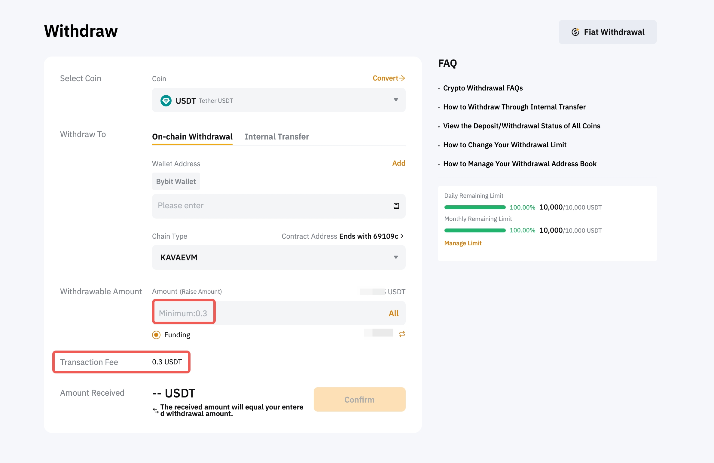 Bybit对所有提现收取固定手续费,并动态调整转账矿工费至更高水平,以保证提现在区块链上拥有更快的确认速度。