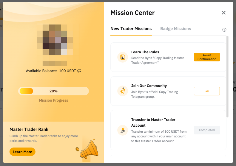 交易达人需要先完成他们的新手任务,才有资格在 Bybit 跟单交易推荐页面上排名和曝光。交易达人可在不同类别中显示排名,只需完成 Bybit 系统用于在跟单交易首页排行榜中显示个人资料的两阶段评估流程即可。具体阶段如下: