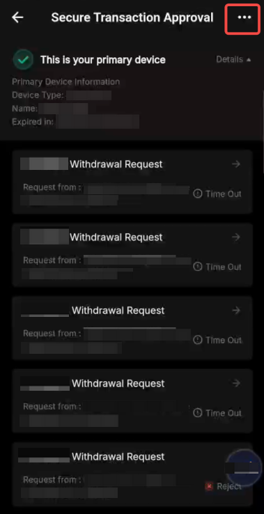 第 1 步:进入安全交易审批页面,点击右上角的三点状图标,选择删除主设备。
