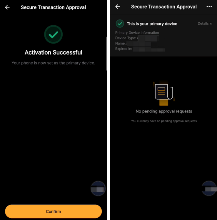 — 在极少数情况下,如果您的主设备没有收到通知,请前往安全设置 → 安全交易审批,查看待处理申请。