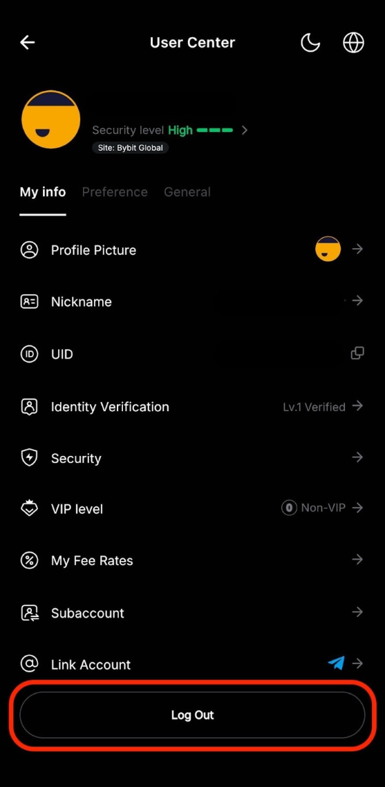 要通过应用程序登出您的 Bybit 帐户,您可以转到您的用户中心,然后单击登出选项卡。对于网站,您可以点击右上角的个人资料图标(步骤 1),然后点击登出选项卡(步骤 2)。