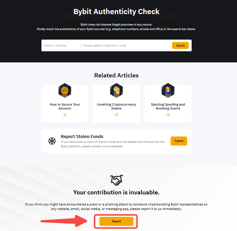 为确保任何与 Bybit 相关的域或信息来源(例如电子邮件、电话号码、URL 或社交媒体帐户)的合法性,请使用Bybit官方验证通道查询功能。