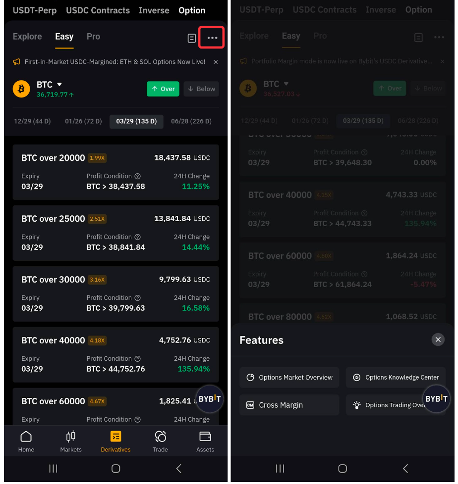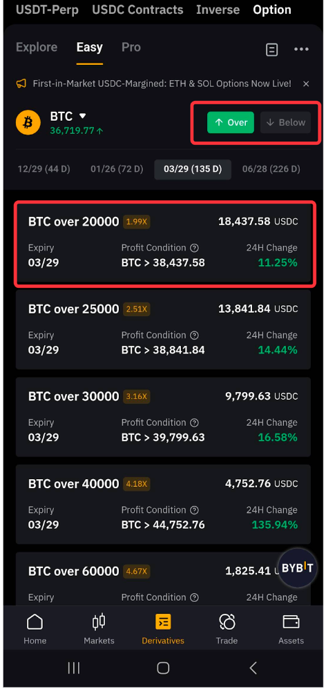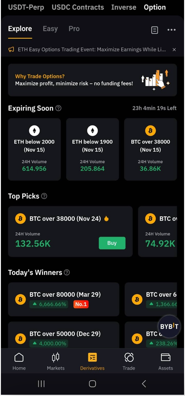 要访问 Bybit 简易期权,请先打开 Bybit App。在首页,选择合约,然后轻点期权。系统将跳转至 Bybit 期权页面,您可以根据自己的期权交易经验从 3 种模式中进行选择。