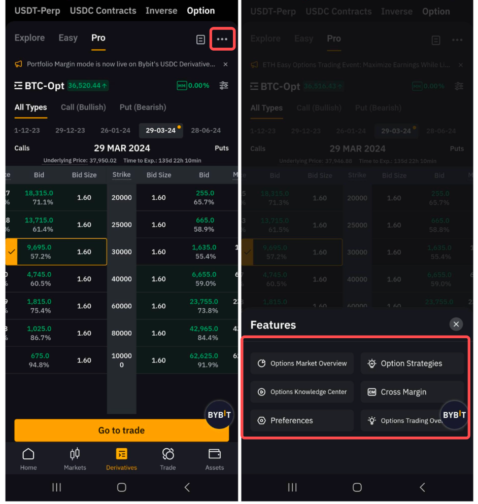 交易者还可以查看其他信息,如期权市场概览、期权知识库或期权交易概览,并通过轻点省略号切换到不同的保证金模式。