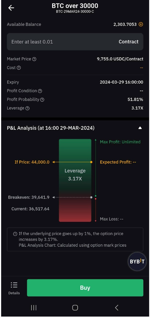 上面的盈亏分析图显示了当前市场价格、基于标记价格模拟的盈亏、盈亏平衡点以及模拟条件下的最佳盈亏情况。查看详细信息后,点击“买入”即可买入合约。