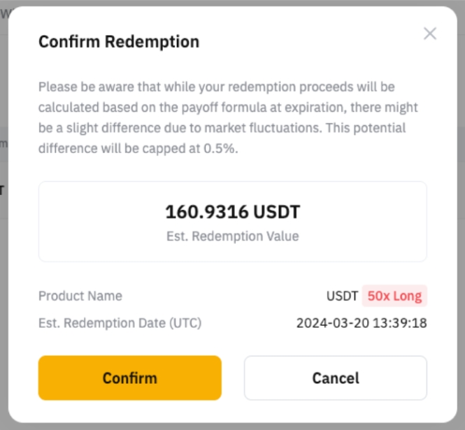 第 2 步:点击相应杠杆无忧计划右侧的赎回按钮,将会弹出一个确认窗口。请仔细核对赎回详情,然后点击确认按钮。