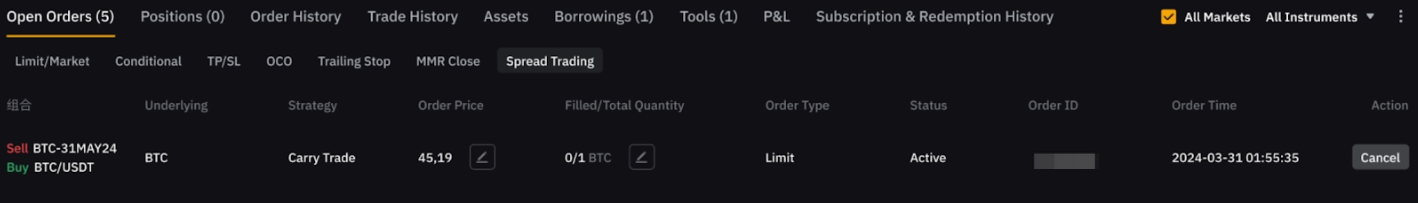 点击下拉菜单,按仅现货、仅永续或仅交割筛选订单。选择全部工具,即可查看所有价差交易订单。