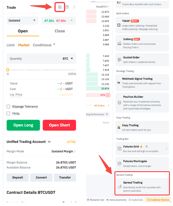 您也可在现货/合约交易页面右侧面板的工具选项卡中找到价差交易。