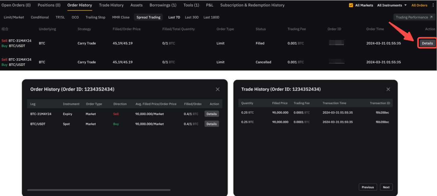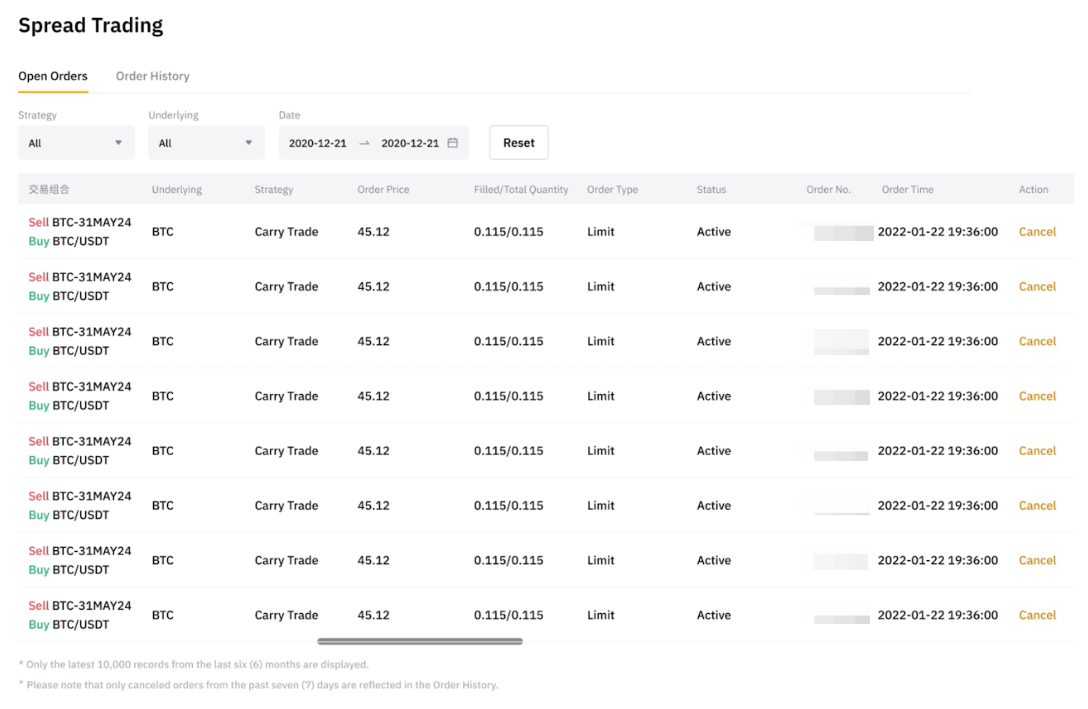您可在任一交易页面(例如价差交易、现货与合约页面)查看价差交易订单,这些页面展示的订单数据完全相同。