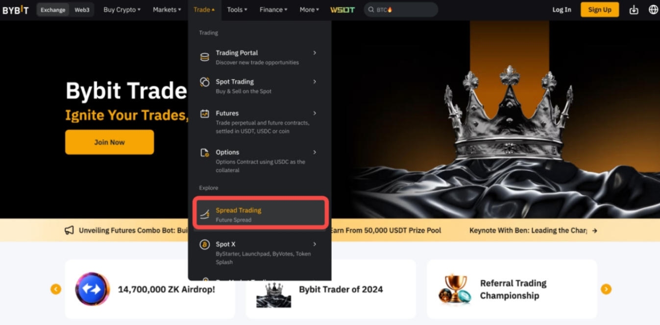 第 1 步:登录 Bybit 官网,在导航栏中点击交易 → 价差交易,进入价差交易页面。