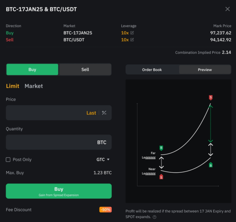 Bybit 价差交易提供了一种更简单的开仓方式,交易者只需轻点几下,即可轻松利用价差获利。该功能支持同时买卖两种金融工具,例如现货、永续或到期日不同的交割合约,以此来对冲风险并放大潜在收益。