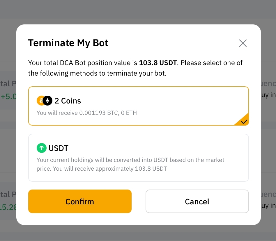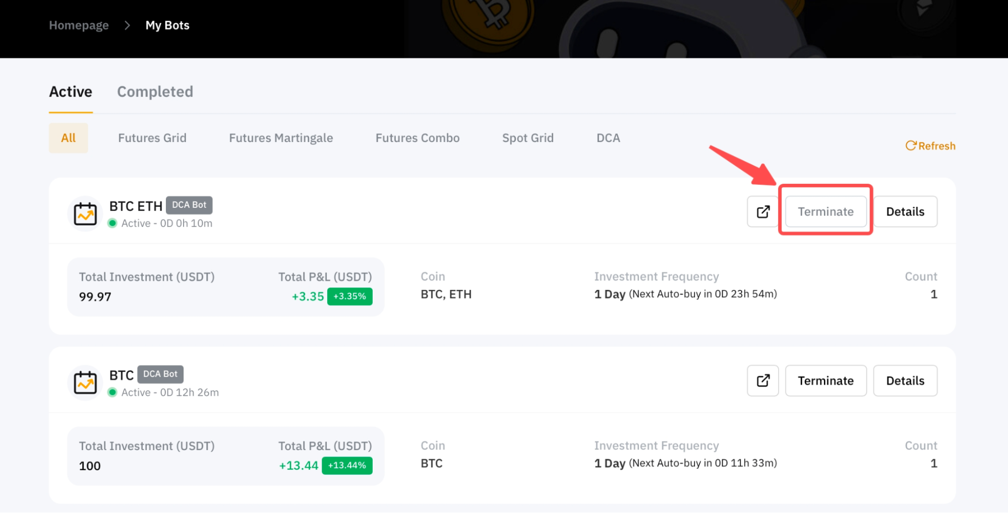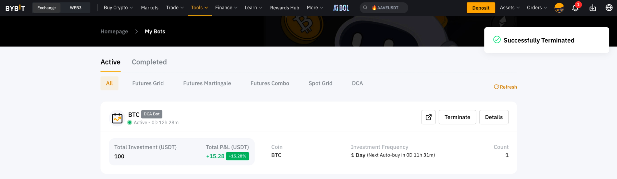 第 2 步:点击 定投 机器人栏右上角的“终止”,即可完成关闭。