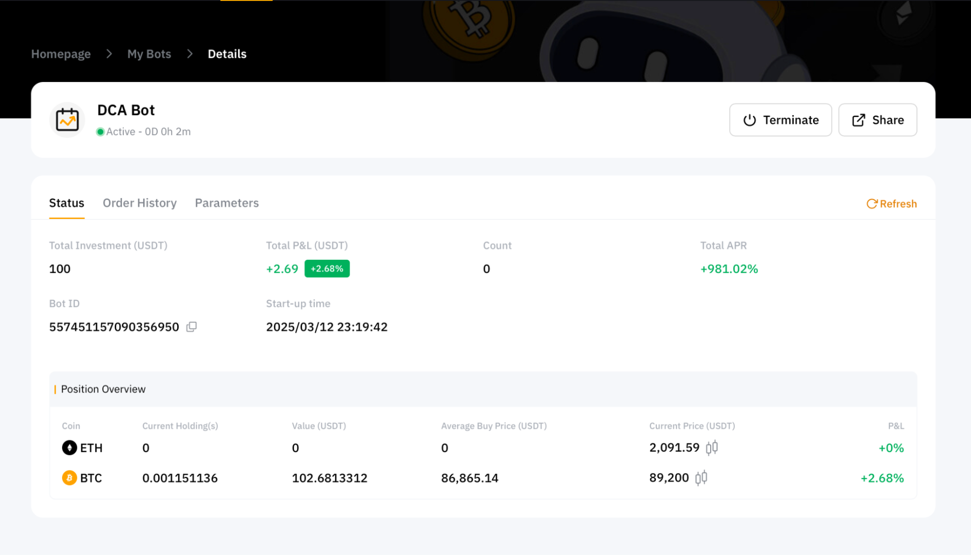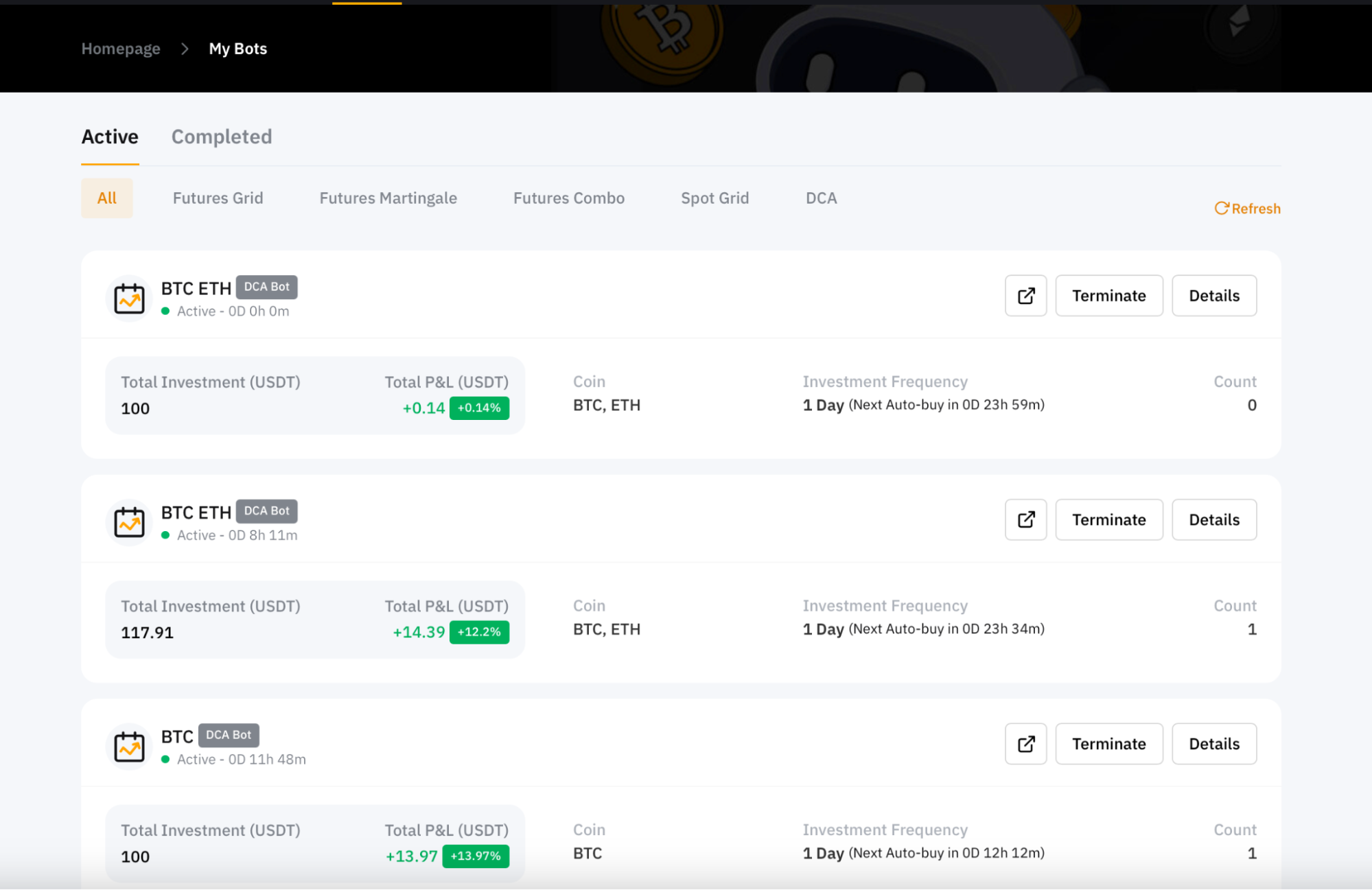 点击“确认”后,页面将自动跳转至“我的机器人”,可供交易者查看处于活动状态的 定投 机器人。