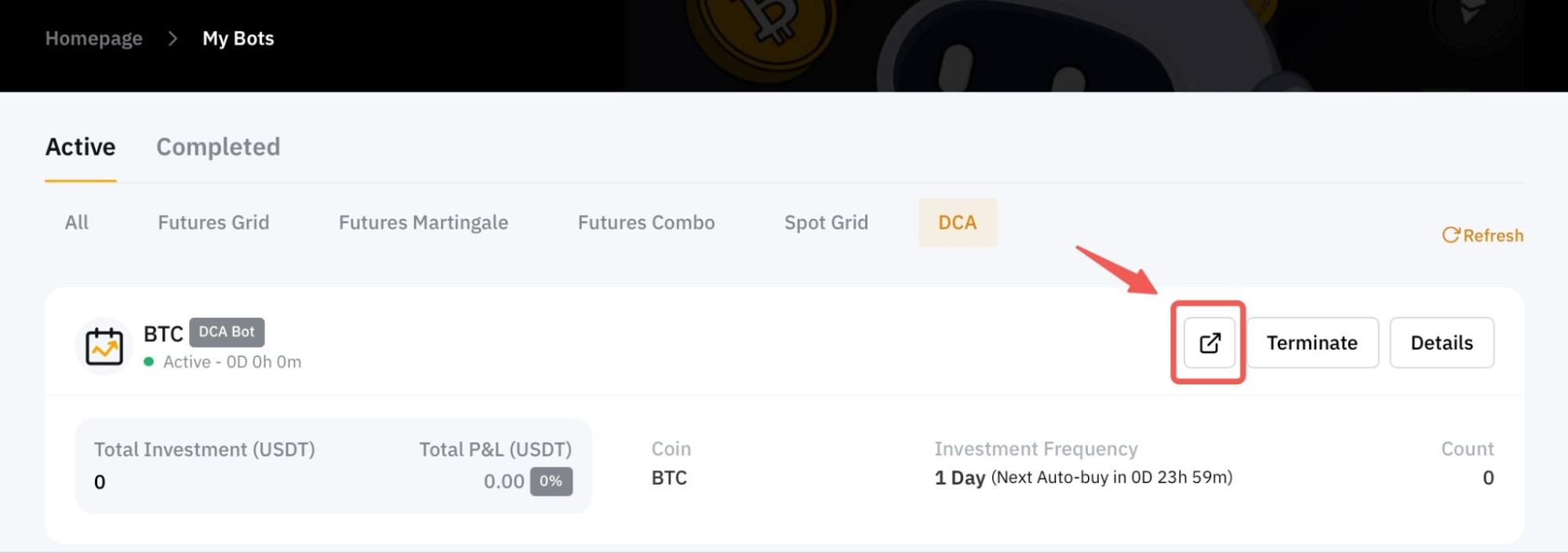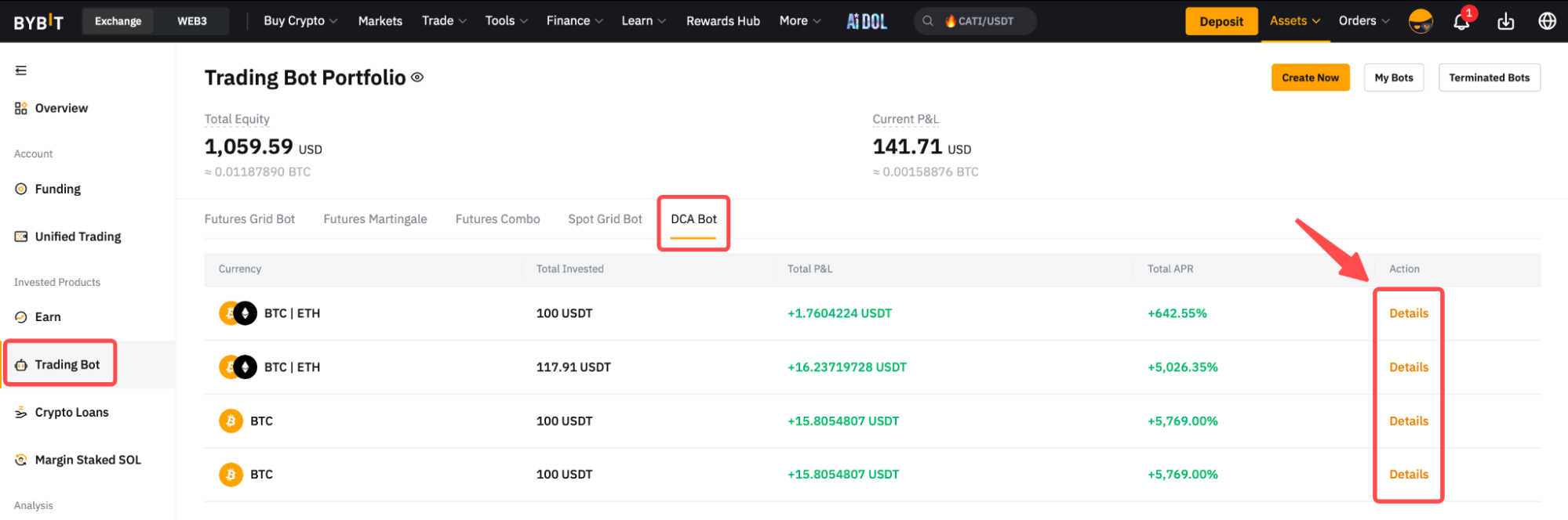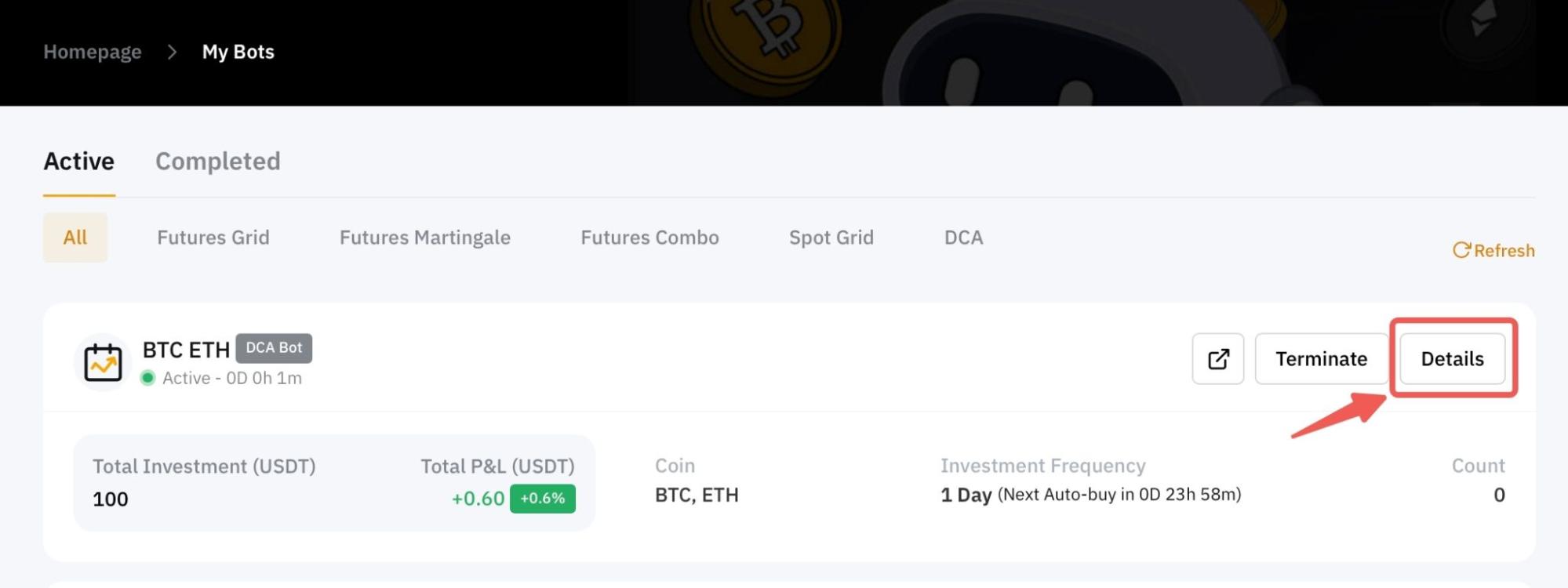 第 1 步:点击 Bybit 交易机器人页面左上角的我的机器人。然后点击 定投 机器人右上角的“详情”,即可修改参数。
